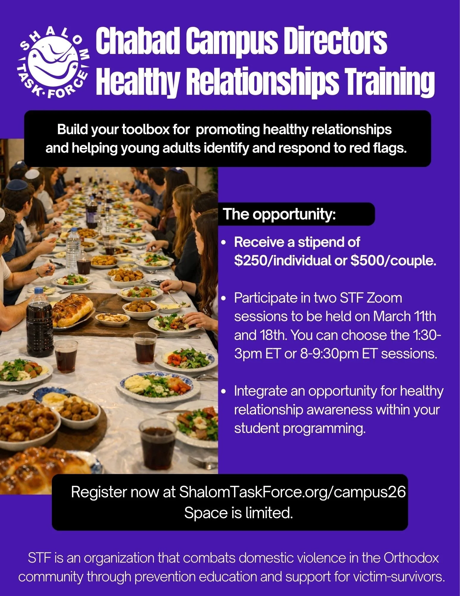 As a follow up, and to be eligible for the stipend, you'll implement an opportunity for healthy relationship awareness among your students. An event could include a related shiur, open conversation, shabbos table dialogue, etc.. We will share some options.